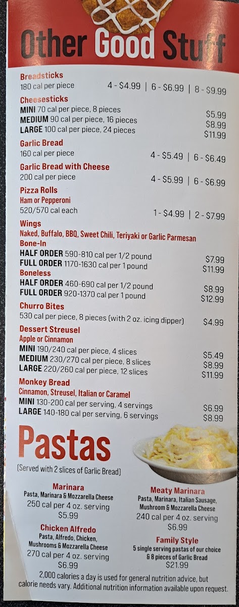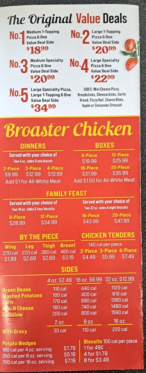 The menu also caters thoughtfully to dietary needs with options like Medium Gluten-Free Cheese Pizza (6 Slices) and Small Gluten-Free Create Your Own 1 Or 2 Toppings (6 Slices), ensuring no one feels left out. For those craving something beyond pizza, savory sides and meals stand out, including Chicken Tenders 2 Piece, Breadsticks (4 Pieces), Garlic Bread With Cheese (4 Pieces), and hearty fried favorites from Broaster Chicken Meals - 4 Pieces to family-sized Broaster Chicken Boxes - 12 Pieces or more. Lighter accompaniments like Coleslaw Individual or Mac-N- Cheese Individual balance the indulgence nicely.