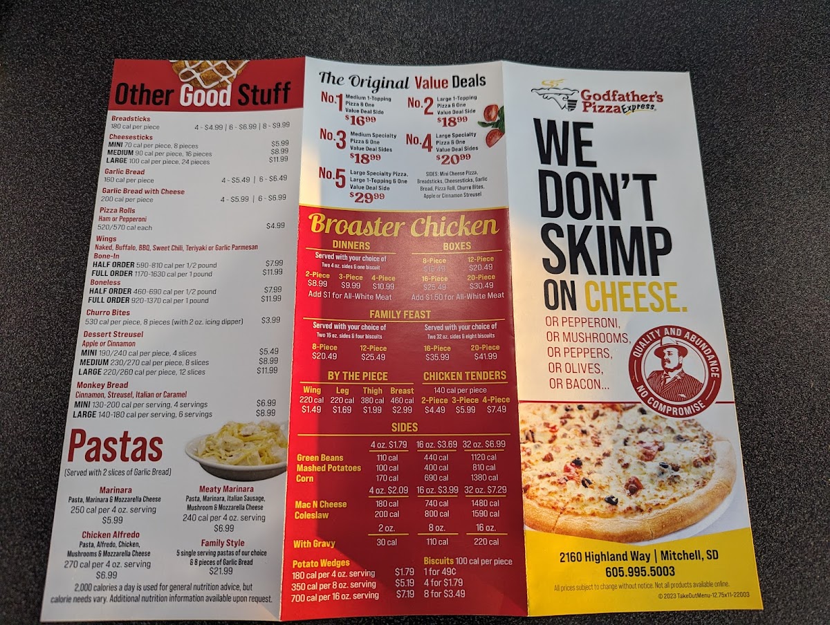 From a reviewer’s perspective, the menu at Godfather's Pizza Express at 2160 Highland Way in Mitchell feels like a well-rounded conclusion to everything the brand does best: convenience, variety, and comfort food done right. The day can start strong with hearty breakfast options like Bacon, Egg & Cheese Breakfast Sandwich, Sausage, Egg & Cheese Breakfast Sandwich, or comforting rolls such as the Ham, Egg & Cheese Roll, alongside shareable Biscuits (Individual) or Biscuits (4). Pizza lovers will appreciate the flexibility and portion choices, from Mini Pepperoni Pizza (4 Slices) and Mini All Meat Combo to larger classics like Large Cheese Pizza (10 Slices) and customizable options such as Large Create Your Own 1 Or 2 Toppings (10 Slices) or Large Create Your Own 3 To 5 Toppings (10 Slices).